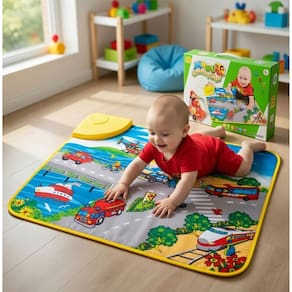 O Tapete Infantil Cidade com Pistas é perfeito para estimular a imaginação das crianças, permitindo que elas criem histórias enquanto brincam com carrinhos em um cenário com rua e meios de transportes.