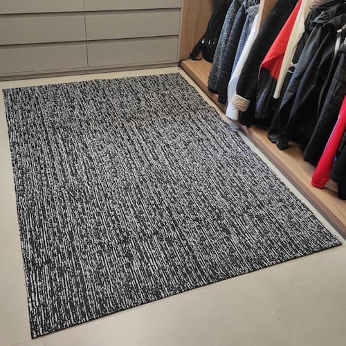 O tapete de poliéster é resistente e fácil de limpar, pois pode ser lavado em máquinas, tornando o tapete uma escolha prática para qualquer ambiente. Este tapete para quarto pode ser uma boa opção para homens e também pode ser em outras áreas da casa, como a sala de estar, escritório doméstico ou até mesmo na sala de jantar, graças ao seu design neutro. O design contemporâneo e estiloso do tapete preto e branco conta uma combinação clássica e atemporal.
