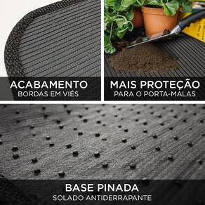 CARACTERÍSTICAS: - Confeccionado em borracha PVC - Base pinada antiderrapante - Tapete de porta malas maleável - Acabamento lateral em viés - Bordado em carpete com o nome do veículo - Acomodação sob medida no porta malas do veículo