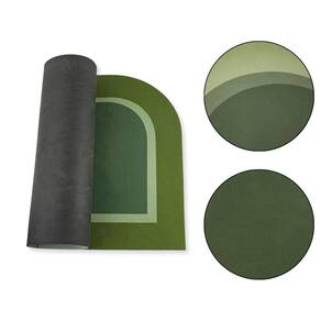 A cor verde, de tom médio a escuro, confere uma sensação vida, limpeza e aconchego. A escrita em uma tipografia clara e elegante, com um tom claro, entrega leveza e elegância ao ambiente. A base é confeccionada em borracha antiderrapante, oferecendo aderência eficiente a pisos lisos, como cerâmica ou porcelanato. Esse recurso garante segurança, evitando deslizamentos e proporcionando estabilidade, além disso, a superfície do tapete é densa, macia e aconchegante ao toque. Feito com fibras grossas, ele possui uma textura espessa que é fofa e confortável para pisar, perfeita para quem gosta de andar descalço, possuindo uma tecnologia que absorve os pés e sapatos molhados em minutos, sem deixar marcas