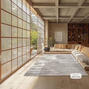 Seu design em tons de cinza, aliado ao sistema de fabricação Jacquard e ao aspecto veludo, cria efeitos óticos impressionantes através de jogos de luz e sombra. A trama com fios finos e flexíveis proporciona uma experiência visual dinâmica, fazendo com que o olhar percorra o tapete continuamente, como se houvesse movimento em cada detalhe.