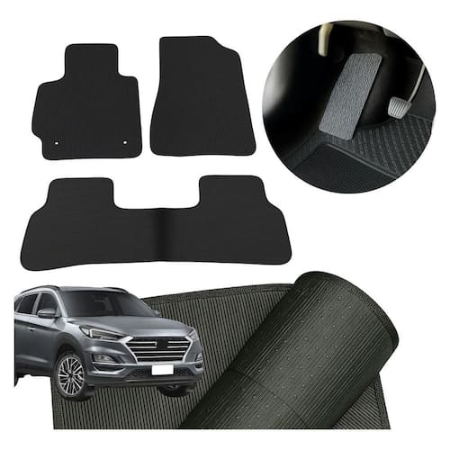 Sobre o Produto - Este jogo de tapetes para Tucson 2017 a 2024 é produzido em borracha PVC automotiva de 4 mm, com base antiderrapante pinada e superfície frisada, ideal para uso diário. - Acompanha descanso de pé na peça do motorista, fixo e resistente não é acolchoado , ideal para proteger a região de maior desgaste.