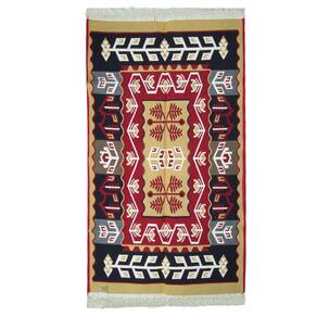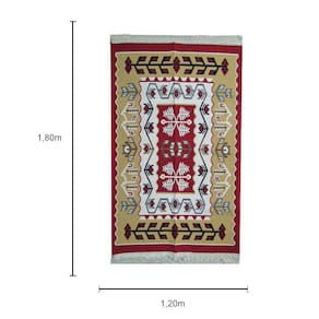 Este tapete em particular apresenta um design encantador, composto por uma mistura harmoniosa de cores vivas e vibrantes. Os tons ricos e intensos incluem vermelho, azul, verde, amarelo e outros matizes atraentes, que dão vida a cada detalhe do padrão. Os motivos geométricos, como losangos, triângulos e formas estilizadas, criam uma estética moderna e visualmente interessante.
