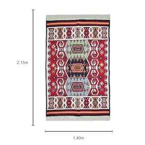 Este tapete Kilim é uma peça única e deslumbrante que combina beleza, tradição e artesanato habilidoso. Com origem nas regiões do Oriente Médio, Europa Oriental e Ásia Central, o Kilim é um tipo de tapete plano tecido à mão, reconhecido pela sua aparência colorida e padrões geométricos distintos.