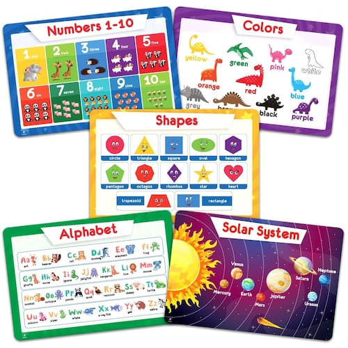 Jogo americano Simply Magic para crianças – conjunto de 5 – inclui: 1. Jogo americano alfabeto \ ABC 2. Jogo americano de formas 3. Jogo americano com números 4. Jogo americano colorido 5. Jogo americano do sistema solar Os tapetes infantis Simply Magic são feitos de plástico polipropileno 100% seguro. A impressão UV vibrante vai durar por anos! A espuma de EVA na parte de trás de cada jogo americano permite que eles se fixem facilmente em uma mesa sem escorregar. Jogo americano antiderrapante, durável, lavável, colorido para crianças. Tamanho perfeito para crianças: 17 polegadas (45 cm) x 11 polegadas (30 cm). - ? PLACEMATS PARA CRIANÇAS PROJETADOS POR PROFESSORES PARA O MELHOR APRENDIZADO - dê Simply magic seus filhos uma vantagem inicial na aprendizagem com um conjunto de lindos jogos americanos de aprendizagem para crianças. - 🎁Presente perfeito para brilhar a curiosidade e apoiar a aprendizagem – os jogos americanos Simply magic são um ótimo presente educacional para crianças e pais. O conjunto de jogos americanos de aprendizagem inclui jogo americano alfabeto ABC, formas, números, cores e sistema solar. Um conjunto perfeito para crianças aprenderem rapidamente o básico e apoiarem seus filhos na aprendizagem! - ? Placemats infantis 100% seguros para mesa de cozinha – os jogos americanos Simply magic são livres de BPA, totalmente compatíveis com CPSIA e ASTM, testados por um laboratório independente. Nosso conjunto de cinco tapetes de mesa é feito de plástico de polipropileno (PP) seguro com espuma EVA antiderrapante. A impressão UV vibrante durará anos! - ? Sobremesas antiderrapantes – duráveis, laváveis e reutilizáveis – basta limpar com um pano úmido para limpar! A parte traseira antiderrapante permite que nossos jogos americanos infantis para mesa de jantar grudem facilmente em qualquer mesa!