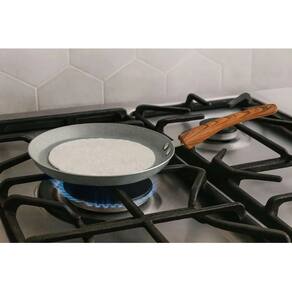 - Faça a cura do revestimento: Unte o interior com óleo ou gordura e logo após aqueça em fogo baixo até o conteúdo esquentar. Após isso, deixe esfriar, descarte o conteúdo e lave normalmente. - Evite esponjas abrasivas e palha de aço.