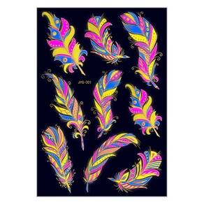 Tatuagem de Pele Temporária Adesivo Fluorescente Balada 1. Descartável: Estas etiquetas impermeáveis de tatuagem são descartáveis, permitindo que os usuários usem padrões diferentes a qualquer hora conforme suas necessidades. 2. Projeto impermeável: As etiquetas de tatuagem são impermeáveis e podem permanecer bonitas ao nadar, banhar-se ou suar durante o exercício. Não se preocupe com seus desenhos de tatuagem borrando ou saindo devido à exposição à umidade. 3. Seguro e não tóxico: Estas tatuagens temporárias são não tóxicas, seguras e inócuas para o corpo. 4. Diversos padrões: O produto contém inúmeros padrões de tatuagem, cobrindo diferentes estilos e temas para atender às necessidades personalizadas de diferentes consumidores. 5. Fácil de usar: Sem ferramentas profissionais, os consumidores podem facilmente aplicar os adesivos de tatuagem à prova d'água em seus corpos para mostrar sua personalidade e estilo a qualquer hora e em qualquer lugar. 6. Brilho: sob luz UV – Fluorescência - ideal para show, bar de boate, festa, balada, etc.