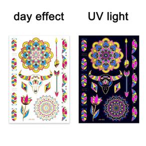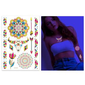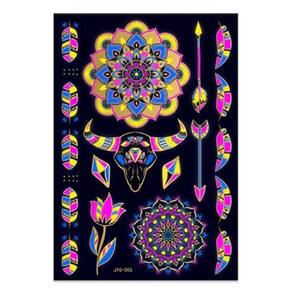 Tatuagem de Pele Temporária Adesivo Fluorescente Balada 1. Descartável: Estas etiquetas impermeáveis de tatuagem são descartáveis, permitindo que os usuários usem padrões diferentes a qualquer hora conforme suas necessidades. 2. Projeto impermeável: As etiquetas de tatuagem são impermeáveis e podem permanecer bonitas ao nadar, banhar-se ou suar durante o exercício. Não se preocupe com seus desenhos de tatuagem borrando ou saindo devido à exposição à umidade. 3. Seguro e não tóxico: Estas tatuagens temporárias são não tóxicas, seguras e inócuas para o corpo. 4. Diversos padrões: O produto contém inúmeros padrões de tatuagem, cobrindo diferentes estilos e temas para atender às necessidades personalizadas de diferentes consumidores. 5. Fácil de usar: Sem ferramentas profissionais, os consumidores podem facilmente aplicar os adesivos de tatuagem à prova d'água em seus corpos para mostrar sua personalidade e estilo a qualquer hora e em qualquer lugar. 6. Brilho: sob luz UV – Fluorescência - ideal para show, bar de boate, festa, balada, etc.