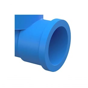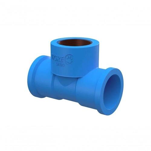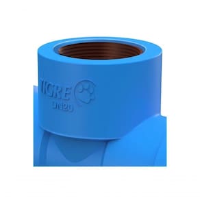 O Tê de 90 Soldável com Bucha de Latão de 3/4'' e 25mm na cor Azul é recomendado para transições entre tubulações plásticas e peças metálicas.