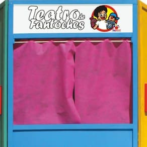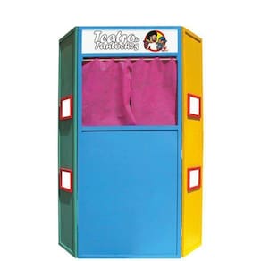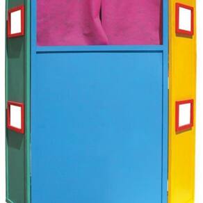 Estrutura de 180 x 160 cm, com madeira na frente e MDF nas laterais (dobrável). Possui uma janela com cortina em TNT. Estimula a recreação, atividades com fantoches, desenvolvendo a criatividade e a dramatização.