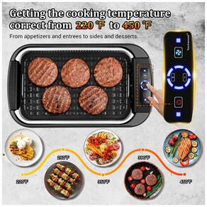 Churrasqueira elétrica portátil com painel de controle, serve 5 porções. Possui tampa de vidro temperado, bandeja de gotejamento, superfície de cozimento antiaderente e controle de temperatura variável. Elemento de aquecimento de 1500W. Sistema de ventilador embutido para redução de fumaça. Placa de grelha removível e bandeja de gotejamento laváveis na máquina de lavar louça.Vendido e entregue por Ecletiq