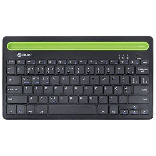 Teclado bluetooth 3.0 2.4 ghz dynamic smart abnt com suporte para tablet ou celular - preto - dt200 Dados técnicos: Padrão: abnt Formato: mini Gravação das teclas: impresso Quantidade de teclas: 78 Multimídia: sim Conexão: bluetooth 3.0 Alcance máximo: 10 m Alimentação: 2 x aaa (não inclusas) Material: plástico Dimensões: 291x159x16mm Peso: 675g Cor: preto com faixa verde Ean: 7908020912040