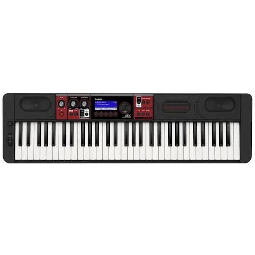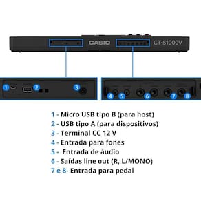Especificações Técnicas- Referência: CT-S1000V- Linha: Casiotone- Teclado: 61 teclas de tamanho padrão- Polifonia máxima: 64- Metrônomo: Sim- MIDI: Recepção multi-timbre de 16 canais- Tomada de força: 9,5 V CC- Falantes: 13 cm x 6 cm oval x 2 saída: 2,5 W + 2,5 W - Consumo de energia: 7,5 W- Dimensões: 93 L x 25,8 P x 9,1 A cm- Peso: Aproximadamente 4,7 kg excluindo baterias - Acessórios incluídos: Adaptador de áudio e MIDI Bluetooth WU-BT10 - Tons: 800- Letra: 100- 150 tons de usuário- Efeitos digitais: Reverberação: 24 Coro: 12- Banco de músicas: Músicas do usuário: 10 Música de demonstração: 1- Acompanhamento automático- Ritmos: 243- Predefinição de um toque: 243- Harmonização automática: 12- Ritmos do usuário: 50Outras funções:Resposta ao toque: 3 tipos, DesligadoTransposição: -12 0 +12 semitonsAfinação: A4 = 415,5 a 465,9 Hz padrão inicial: 440,0 Hz , variável em passos de 0,1 HzAjuste de Escala Temperamento : Igual + 16 outros tiposFunção APPToque de acordesCriador de LetrasTerminais de entrada/saída:Tomada PHONES/OUTPUT: Mini jack estéreo 3,5 mm Voltagem de saída: 1,2 V RMS MAXTomada AUDIO IN: Minitomada estéreo 3,5 mm Impedância de entrada: 10kOTensão de entrada: 200mVPorta USB: Conector micro BPEDAL: Conector padrão 6,3 mm Sustentação do pedal, sostenuto, suave, metrônomo Fonte de energia:Alimentação de 2 vias6 pilhas alcalinas de tamanho AA ou pilhas recarregáveis de níquel-hidreto metálico de tamanho AAOperação contínua: aproximadamente 16 horas pilhas alcalinas , aproximadamente 13 horas pilhas recarregáveis de níquel-hidreto metálico Adaptador CA padrão JEITA, com plugue de polaridade unificada , desligamento automático de 30 minutos pode ser desativado. Homologação Anatel: 087441811958