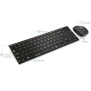 O Combo Teclado e Mouse Sem Fio conta com teclas de perfil baixo e 14 teclas multimídia de atalho.