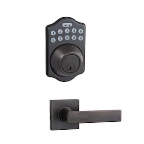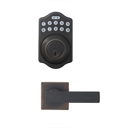 Amazon Basics - Fechadura de porta com teclado eletrônico tradicional com alavanca de passagem, bronze polido a óleo, 1 pacote - Entrada segura sem chave: função de teclado e fechadura motorizada para travamento conveniente com um toque; atende aos padrões ANSI de grau 3 para segurança e resistência. Observação: meça o verso, o furo transversal e a espessura da sua porta para garantir que você encontre o ajuste certo. Observação: meça o verso, o furo transversal e a espessura da sua porta para garantir que você encontre o ajuste certo. - Programação simples: a programação do teclado fácil de usar facilita adicionar ou excluir usuários em segundos - Ajuste perfeito: acomoda a espessura da porta de 1-3/8 a 1-3/4 polegadas; a maçaneta da porta se encaixa em orifícios de porta de tamanho padrão (54 mm); trava ajustável de 6 vias para qualquer fundo de 2-3/8 polegadas (60 mm) ou 2-3/4 polegadas (70 mm) - Alavanca reversível e durável: pode ser instalada em portas destros e canhotos; feito de zinco resistente, aço e materiais de aço inoxidável - Fácil de instalar e garantia: instalação simples com uma chave de fenda (todos os componentes de hardware necessários incluídos); apoiado por uma garantia limitada de 1 ano da Amazon Basics - Apenas para uso interno