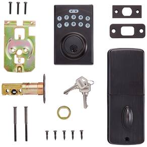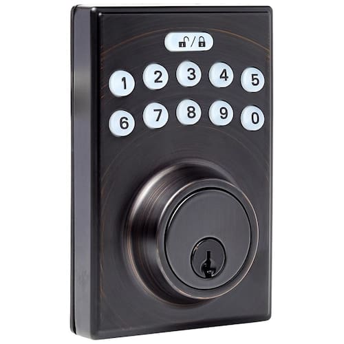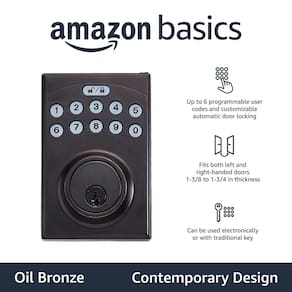 Amazon Basics Fechadura de porta com teclado eletrônico com entrada sem chave com controle de toque, opção de entrada com chave, contemporânea, bronze óleo, 1 pacote - Conveniência de entrada sem chave: experimente a facilidade de controle de toque com nossa trava de porta de entrada sem chave. Esta fechadura eletrônica oferece acesso seguro, mantendo sua casa protegida - CÓDIGOS DE SEGURANÇA PERSONALIZÁVEIS: Proteja sua casa com uma fechadura digital que permite 6 códigos de usuário e códigos temporários de uso único para convidados para acesso controlado sempre que necessário - CARACTERÍSTICA DE BLOQUEIO AUTOMÁTICO: Desfrute de paz de espírito com uma trava de bloqueio automático que prende sua porta 10 a 99 segundos após a entrada - Compatibilidade de porta versátil: esta fechadura de porta de teclado é projetada para se ajustar às preparações de porta padrão, acomodando espessuras de porta de 3,5 a 3,5 cm - Opções de operação dupla: use a fechadura do teclado para fácil acesso ou uma tecla tradicional externa, complementada por uma trava de giro de polegar dentro para opções de segurança flexíveis e confiáveis