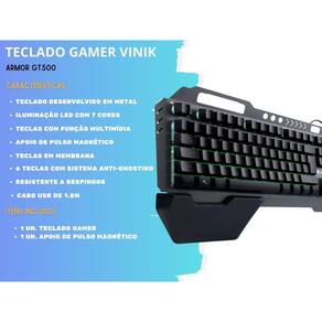 Teclado Gamer Barato ABNT2 Estrutura de Membrana Apoio de Pulso Ergonômico GT500 Teclado Gamer desenvolvido em Metal que proporciona maior qualidade, resistência e robustez. Design ergonômico buscando dar conforto ao usuário, acompanhado por seu apoio de pulso magnético que pode ser fixado no teclado. Sistema de teclas em membrana que mantem uma digitação macia e silenciosa, além da iluminação led que possui 7 opções de cores que deixará o seu setup muito mais bonito e elegante. Teclas com funções multimidias que facilitarão o seu acesso a softwares, aplicativos e widgets. Você também pode aproveitar o encaixe superior do teclado para posicionar o seu celular de forma vertical enquanto realize lives ou trabalha. Marca: VinikModelo GT500Condição: NovoMaterial: Metal e ABSEstrutura Teclas: MembranaConexão: USBTamanho do Cabo: 1.8mGravação das Teclas: Laser PritingIluminação Led: 7 Cores - Azul Claro, Azul Escuro, Vermelho, Roxo, Amarelho, Verde e LilasQnt Teclas: 107Cor: Preto/ChumboTeclas MultimídiaSistema AntiGhosting em 6 TeclasCompatibilidade com Windows e LinuxDimensões: 470x215x45mm - ITENS INCLUSOS - 1 Un. Teclado Gamer GT5001 Un. Apoio de pulso Magnético - GARANTIA - 3 Meses de Garantia Contra Defeitos de FabricaçãoHomologação Anatel: 001011407379