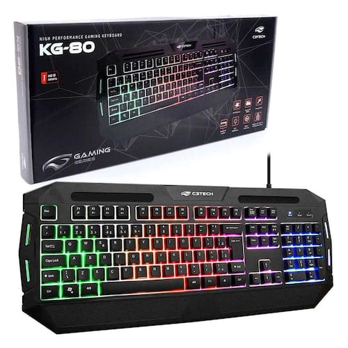 Marca: c3techModelo: kg-80bk O kg-80 e um teclado gamer da c3tech para todas as partidas seu design moderno com apoio de punho e controle de iluminação personalizado permite que você vá além do jogo. As 12 teclas de atalho facilitam o uso, e a função anti-ghosting te mantem no comando. Com o kg-80 você sempre sai ganhando Especificações: Dimensão: 490x219x32 mm Peso: 740 g Conexão: usb 1.1/2.0 Sistema de tecla: membrana Tipo de gravação na tecla: serigrafia laser Quantidade de botões: 107 Layout: abnt2 Possui atalhos multimídia: sim Qtde atalhos multimídia: 12 Possui iluminação: sim Tipo de iluminação: multicores Comprimento de cabo: 1.45 m Revestimento de cabo: pvc Anti-respingo: sim Ergonômico: sim Plug and play: sim Compatibilidade: windows 7/8/10, macos Tensão de operação: dc 5v Alimentação: usb Características gaming Possui software: não Possui macro: não Possui iluminação: sim Tipo de iluminação: multicores Possui atalhos para controle de led: sim Qtde atalhos led: 2 Possui atalho para bloqueio de tecla win: sim Possui atalho para bloqueio de tecla fn: não Possui anti-ghosting: sim Nível de anti-ghosting: 16 teclas