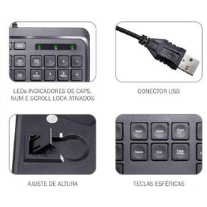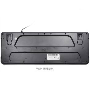 TECLADO KME728 - Teclado multimídia KM-E728Teclado preto com fio padrão ABNT2 com cantos arredondados Teclas com formato esférico Noventa e cinco teclas + doze teclas multimídia Compatível com Windows XP, Vista, 7, 8 e 10 LED verde indicador de Num Lock, Caps Lock e Scroll Lock ativados Caracteres impressos a laser para maior durabilidade Teclado multimídia KM-E728 Especificações técnicas: Teclas com membrana táctil Comprimento do cabo sem conector : 1900mm 50mm tolerância Dimensão do teclado AxLxP : 26x162x438mm Tipo de conector: USB . Plug and play INFORMAÇÕES DA EMBALAGEM: Embalagem individual com 01 uma unidade Dimensões CxLxA : 455x45x192mm Peso líquido: 0,485kg Peso bruto: 0,625kg Características Gerais do Produto: Material: Plastico : 90 Marca: Não Informado