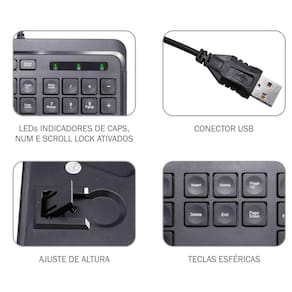 TECLADO KME728 - Teclado multimídia KM-E728Teclado preto com fio padrão ABNT2 com cantos arredondados Teclas com formato esférico Noventa e cinco teclas + doze teclas multimídia Compatível com Windows XP, Vista, 7, 8 e 10 LED verde indicador de Num Lock, Caps Lock e Scroll Lock ativados Caracteres impressos a laser para maior durabilidade Teclado multimídia KM-E728 Especificações técnicas: Teclas com membrana táctil Comprimento do cabo sem conector : 1900mm 50mm tolerância Dimensão do teclado AxLxP : 26x162x438mm Tipo de conector: USB . Plug and play INFORMAÇÕES DA EMBALAGEM: Embalagem individual com 01 uma unidade Dimensões CxLxA : 455x45x192mm Peso líquido: 0,485kg Peso bruto: 0,625kg Características Gerais do Produto: Material: Plastico : 90 Marca: Não Informado