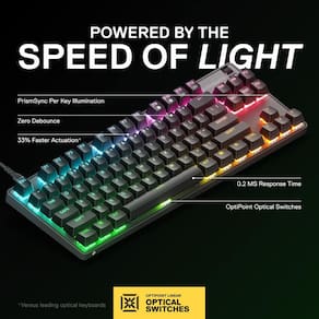 SteelSeries Apex 9 TKL - Teclado mecânico para jogos - Interruptores ópticos - Atuação de 2 pontos - Tamanho compacto sem chave - Interruptores removíveis - Layout dos EUA (QWERTY) - Jogue na velocidade da luz — supere os teclados ópticos líderes com atuação 33% mais rápida usando interruptores OptiPoint personalizados sem debounce e um tempo de resposta ultrarrápido de 0,2 ms. - Atuação de 2 pontos — adapte-se a qualquer jogo alterando a profundidade de registro de um toque rápido e leve de 1 mm para um toque de tecla deliberado de 1,5 mm. - Interruptores intercambiáveis: personalize, atualize e repare seu teclado alterando os interruptores para o seu estilo favorito de switch OptiPoint. - Fator de forma TKL simplificado — Jogue como os profissionais com um teclado compacto e ergonômico sem teclado que deixa mais espaço para deslizes amplos do mouse. - Teclas PBT duráveis — Teclas PBT de disparo duplo de longa duração e à prova de desbotamento fornecem uma textura de alta qualidade para uma sensação aprimorada de teclas, bem como melhor precisão de digitação. O layout deste teclado é QWERTY americano