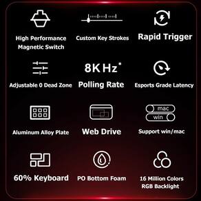 Teclado magnético para máquinas de jogos MADLIONS MAD60HE/MAD68HE No ambiente de jogo competitivo de hoje, escolher um teclado de alto desempenho é crucial. O teclado magnético para jogos da série MADLIONS MAD60HE/MAD68HE é projetado para jogadores que buscam a excelência, tornando-o a escolha ideal para jogadores convencionais. Interruptores magnéticos de alto desempenho. A série MADLIONS MAD60HE/MAD68HE possui interruptores magnéticos autodesenvolvidos, combinados com um driver de placa de rede que não consome memória, suportando taxas de pesquisa de até 8000Hz. Isso significa que cada tecla pode alcançar uma digitalização ultrarrápida de 16K, garantindo tempos de resposta rápidos e dando a você uma vantagem no jogo. - Interruptores magnéticos de alto desempenho: o MAD60HE possui interruptores magnéticos autodesenvolvidos, combinados com um driver de placa de rede que não consome memória, suportando taxas de pesquisa de até 1000Hz, garantindo tempos de resposta rápidos e dando a você uma vantagem no jogo - Mais adequado para jogos FPS: em jogos FPS como Valorant e CS2 que exigem disparo de parada de emergência, os interruptores magnéticos equipados com MADE60 podem permitir que você espie melhor e mais rápido, o que desempenhará um papel na precisão do disparo e posicionamento preciso. Função de assistência óbvia - Tecnologia de disparo rápido: a série tem uma distância de passo RT de até 0,02 mm, oferecendo tempos de resposta extremamente rápidos que ajudam os jogadores a manter uma vantagem competitiva em partidas intensas. Seja disparo rápido ou ações combinadas complexas, a MADLIONS garante uma experiência incomparável - Ação ajustável: o MAD60 HE vem com um driver patenteado baseado na web que permite aos usuários remapear facilmente chaves, configurar macros e personalizar efeitos de iluminação - Design 60% compacto: este teclado de 60% para jogos tem um tamanho pequeno e é bom para todos os ambientes, jogos de viagem de negócios, uso doméstico, sem teclado numérico, mais prático para jogadores e digitadores, dá mais espaço à sua área de trabalho - Iluminação RBG personalizada: o design da posição da luz inferior melhora o efeito de exibição das teclas impressas na lateral. Ele também usa um design de iluminação RGB de 16 milhões de cores, que suporta uma variedade de equivalentes personalizados ajustáveis para melhorar o apelo visual do teclado