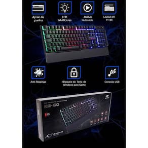 Teclado USB Gamer C3tech Multimídia com LED - Preto - KG-60BK O Teclado Gamer KG-60 tem tudo o que precisa para sair na frente e aprimorar suas jogadas Conta com 12 teclas de atalho, sistema de iluminacao, funcoes especiais para jogos como anti-ghosting, possibilitando que o usuario aperte varias teclas ao mesmo tempo sem perder qualquer comando. Seu design compacto sem abrir mao de nada, vai te conquistar Mais detalhes do produto - Marca C3 Tech - Modelo KG60BK - Garantia 12 meses - Dimensão: 43717543 mm - Peso: 600 g - Conexão: USB 1.1/2.0 - Sistema de Tecla: Membrana - Formato da Tecla: Teclas altas - Tipo de Gravação na Tecla: Laser - Qtde Botões: 107 - Layout: ABNT2 - Possui Atalhos Multimídia: Sim - Qtde Atalhos Multimídia: 12 - Possui Iluminação: Sim - Tipo de Iluminação: Multicores - Comprimento de Cabo: 1.5 m - Revestimento de Cabo: Nylon - Anti-Respingo: Sim - Ergonômico: Não - Plug and Play: Sim - Compatibilidade: Windows XP/Vista/7/8/10, Linux Características das funções gamer - Possui Software: Não - Possui Macro: Não - Possui Iluminação: Sim - Tipo de Iluminação: Multicores - Possui Atalhos para Controle de LED: Sim - Qtde Atalhos LED: 2 - Possui Atalho para Bloqueio de Tecla Win: Sim - Possui Atalho para Bloqueio de Tecla FN: Não - Possui Anti-Ghosting: Sim - Nível de Anti-Ghosting: 16 teclas