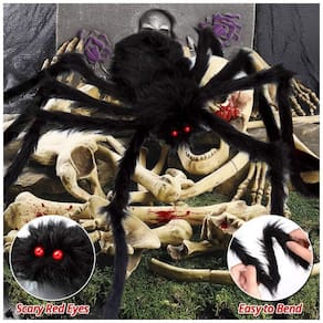 Design vívido e assustador Aranha preta peluda com olhos vermelhos assustadores e corpo peludo parece real. Prenda bem uma enorme teia de aranha, incrível e assustadora, faça sua peça central principal do seu tema de Halloween. Conquiste a atenção de crianças e adultos no Carnaval Fantasma, no Baile de Máscaras, no Desfile de Halloween e nas Travessuras ou Travessuras.