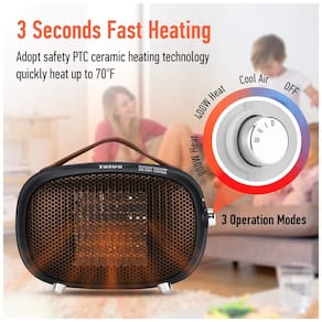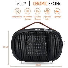 AQUECIMENTO RÁPIDO E PODEROSO Equipado com elementos de aquecimento de cerâmica avançados, o aquecedor de ambiente pequeno Teioe fornece aquecimento mais rápido e com maior eficiência energética. Este aquecedor elétrico de ambiente aquece até 21 C em 3 segundos, perfeito para uso em quarto, escritório e mesa. SEGURANÇA AVANÇADA Nosso aquecedor portátil é feito de material retardador de chamas. Construído com vários recursos de segurança, incluindo proteção contra superaquecimento, proteção contra tombamento, desligamento automático de 8 horas e desligamento com atraso de 30 segundos. Aquecedor de ambiente para uso interno. FÁCIL DE USAR Ajuste o botão de rotação para escolher três modos. 800 W de alta temperatura, 400 W de baixa temperatura e modo de vento natural. O modo de aquecimento alto , baixo sopra ar quente em velocidades diferentes para aquecer o ar. Isso torna o aquecedor de ambiente pequeno a escolha ideal para o seu espaço pessoal em casa e no escritório. MINI RETRO DESIGN Este mini aquecedor de ambiente adota um design retro moderno. A aparência refrescante pode decorar sua casa ou escritório enquanto o mantém aquecido. O mini aquecedor é o presente de Natal ideal para família e amigos
