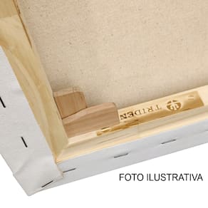 Tela grampeada na parte posterior da tela, que poderá receber ajustes de tensão, através da fixação de cunhas de madeira, que seguem junto com o produto.