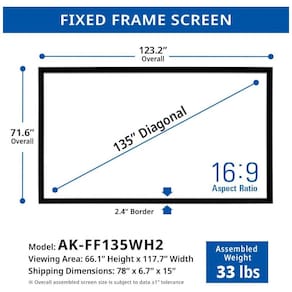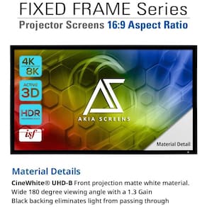 A tela de projeção fixa de 135" da AKIA SCREENS foi desenvolvida para instalação permanente em parede, com formato 16:9 e área de imagem ampla para salas de home theater e ambientes de projeção de grande porte. A superfície de projeção utiliza o material CineWhite UHD-B, com ganho de 1,3 e difusão uniforme, proporcionando brilho consistente, bom nível de contraste e reprodução de cores adequada para conteúdos em alta definição, 4K e 8K.