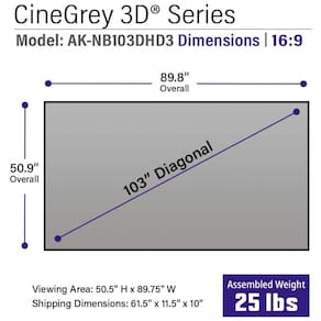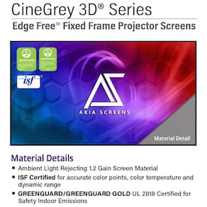 A tela de projeção fixa ALR de 103 polegadas da Akia Screens com material CineGrey 3D foi desenvolvida para uso com projetores de longo alcance padrão em ambientes internos, oferecendo área de visualização em formato 16:9 adequada para home theater, salas de TV, jogos e apresentações. O material CineGrey 3D é uma superfície de rejeição de luz ambiente que reduz reflexos de teto e iluminação da sala em até 65%, elevando o contraste, os níveis de preto e a saturação de cores em relação a telas brancas convencionais.