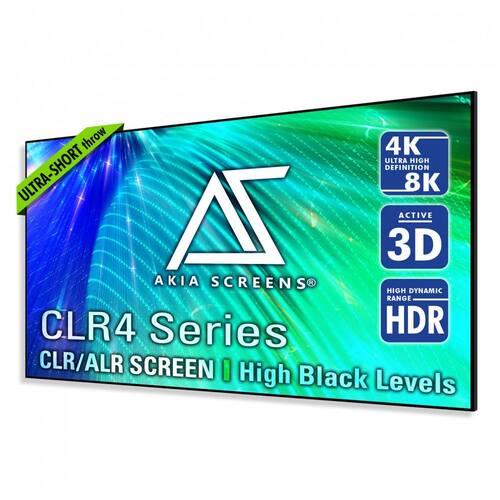 A tela de projeção fixa ALR de 123 polegadas da Akia Screens é projetada para uso com projetores de ultracurta distância instalados sobre mesa ou rack, oferecendo grande área de exibição em formato 16:9 para aplicações de cinema em casa e salas multimídia. O material de projeção utiliza tecnologia CLR4 (Ceiling Light Rejecting), que foi desenvolvida para reduzir a interferência da luz proveniente do teto, melhorar o nível de preto e aumentar o contraste em relação às telas brancas convencionais.