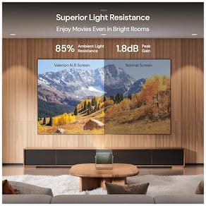 A tecnologia de rejeição de luz ambiente foi desenvolvida para bloquear grande parte da luz proveniente do teto e das laterais, permitindo uso em salas com janelas e luminárias sem necessidade de escurecimento completo. A tela oferece até 85% de rejeição de luz ambiente, o que contribui para manter a nitidez da imagem em sessões de filmes, esportes, jogos e apresentações durante o dia ou à noite.