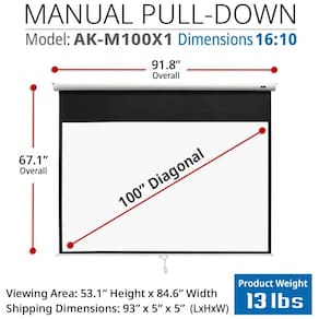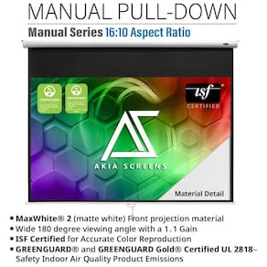 A tela de projeção manual retrátil Akia Screens de 100 polegadas foi desenvolvida para uso em home theater, escritórios e salas de aula que utilizam projetores de longo alcance no formato 16:10, mantendo compatibilidade também com conteúdos em 16:9 e 4:3. Ela oferece área de projeção de 215 x 135 cm, em carcaça metálica branca projetada para montagem em parede ou teto, acompanhada de suporte tipo L de 10 polegadas que afasta a tela da parede para melhor posicionamento em relação a portas, rodapés ou móveis.
