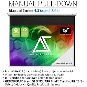 A tela de projeção manual retrátil Akia Screens de 100 polegadas foi desenvolvida para uso em home theater, escritórios e salas de aula que utilizam projetores de longo alcance no formato 4:3, mantendo compatibilidade com conteúdos em 16:9 e 16:10. Ela oferece área de projeção de 203 x 152 cm, em carcaça metálica branca para montagem em parede ou teto, acompanhada de suporte tipo L de 10 polegadas que afasta a tela da parede para melhor posicionamento em relação a portas, rodapés ou móveis.