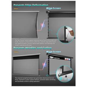 A área útil de exibição mede aproximadamente 266 cm de largura por 149 cm de altura, oferecendo uma tela grande para filmes, esportes e apresentações em grande formato. O sistema tab-tension utiliza cabos laterais de tensionamento e barra inferior com peso para manter a tela plana, reduzindo ondulações nas bordas e garantindo uma superfície uniforme para foco adequado em toda a imagem.