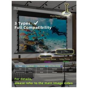 A carcaça em alumínio com acabamento branco permite instalação em teto ou parede com diferentes arranjos de fixação em estruturas de madeira ou concreto atendendo layouts variados de sala. O acionamento é motorizado com operação automática por controle remoto garantindo movimento suave e estável e permitindo integrar a tela a projetos de home theater residenciais e salas de apresentação de uso frequente.