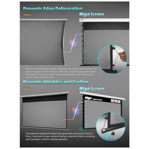 A área útil de projeção é de cerca de 266 cm de largura por 149 cm de altura proporcionando um quadro amplo para filmes esportes e apresentações em tela grande. O sistema tab tension combina cabos de tensionamento lateral e barra inferior com peso de aproximadamente 9 lb mantendo a superfície plana durante todo o curso de descida e subida da tela para melhor foco e nitidez em toda a área exibida.