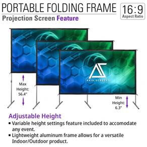 A tela integra a linha de estruturas dobráveis portáteis da AKIA SCREENS, com ajuste de altura para adequação a diferentes ambientes e posicionamento do feixe de projeção. A combinação de quadro em alumínio, pés em T e superfície de projeção frontal com parte traseira escura contribui para estabilidade mecânica e controle de luminosidade ambiente.