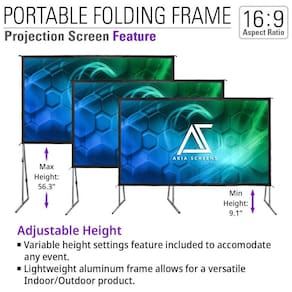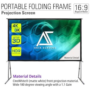 A tela de projeção portátil AKIA SCREENS de 145" foi desenvolvida para aplicações de cinema em casa e eventos, oferecendo grande área de visualização em formato 16:9 para projeções em alta resolução 4K e 8K. O material de projeção CineWhite possui ganho de 1,1, superfície de difusão uniforme e parte traseira preta, contribuindo para brilho homogêneo, bom contraste e reprodução de cores consistente em diferentes ângulos de visão.