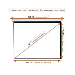 Modelo: TBMS084H Área de projeção: 168 x 104 cm. Dimensões embalada: 10 x 13 x 205 cm. Dimensões do estojo metálico: 07 x 09 x 186 cm. Dimensões em polegadas: 84" Peso da embalagem: 9,0 Kg. Peso do produto: 7,2 Kg. Formato: 1:1 (quadrado). Garantia: 12 meses. Bordas: Sim (pretas). Tecido: Matte White 1.1 Código de barras: 7891516997327