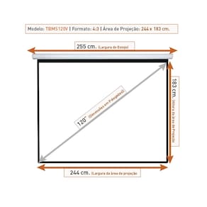 Modelo: TBMS120V Área de projeção: 244 x 183 cm Dimensões embalada: 10 x 13 x 274 cm Dimensões do estojo metálico: 07 x 09 x 255 cm Dimensões em polegadas: 120" Peso da embalagem: 11,5 Kg Peso do produto: 9,9 Kg Formato: 4:3 (Padrão Corporativo) Garantia: 12 meses Bordas: Sim (pretas) Tecido: Matte White 1.1 Código de barras: 7897570141287