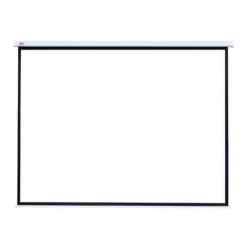 A tela de projeção retrátil Série A da TES possui acionamento manual, estojo em aço carbono na cor branca e pode ser fixada no teto ou na parede.