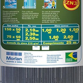 Características Gerais Descrição do Produto Tela Segurança Soldada Morlan 75X50Mm Fio 2,10Mm 1,20M.25 Metros Ideal para Cercar áreas industriais, comerciais e residenciais Malha 75 x 50 Mm Fio 2,10 Mm Metragem 1,20 X 25 M Rolo 25 M SAC - Fornecedor Fornecedor Morlan Telefone (11) 3897-1882