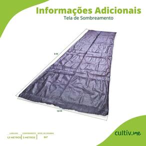 Características * Produto: Tela de Sombreamento Especial * Marca: ALL GARDEN * Cor: Preta * Nível de sombreamento: 80% * Largura: 1,5 m * Comprimento: 5 m * Material: Polietileno de alta resistência