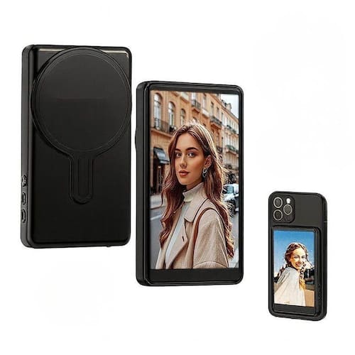 Tela Monitor Selfie Preto para Celular com Anel magnético Tela Monitor de Selfie Preto para Celular ===================================== Tela Monitor de Selfie Vlog para Celular, ideal para quem deseja melhorar a experiência de tirar selfies, gravar vídeos ou realizar videochamadas usando a câmera traseira de smartphones com muito mais qualidade.