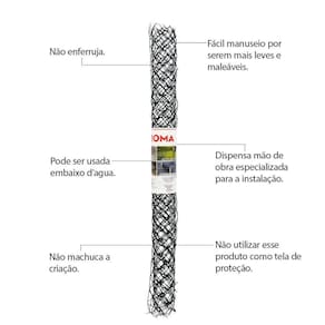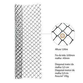Tela Proteção Cercado Janela Jardim Apartamento 40mm 1mx10m Cor: Preto A Tela Roma, também conhecida como tela hexagonal, foi desenvolvida para substituir telas metálicas e galvanizadas em cercamento. Produto versátil pode ser utilizado em diversas finalidades tais como: Estrutura de argamassa;Estrutura de gesso;Estuques;Criação de animais e aves;Cercamento;Decoração;Contenção de grama e plantas;Sinalização de tubulações subterrâneas em caso de escavações. Produzida em Polietileno de Alta Densidade PEAD , é leve e de fácil instalação. Dimensões: Altura: 1,00m. Fio da tela 3,00mmMalha da tela 40mm Diagonal maior da malha da malha 5,5cm Diagonal menor da malha da malha 5,0cm Peso/m 170g Dimensões de fios e malhas são aproximadas.