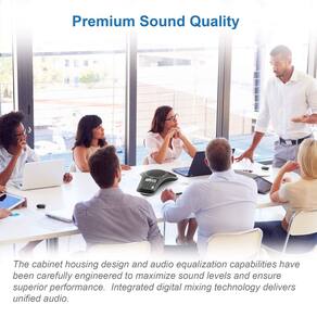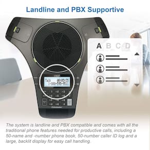 USBVTech Telefone de conferência VCS702 ErisStation DECT 6.0 com dois microfones sem fio usando tecnologia sem fio Orbitlink - Inclui 2 microfones sem fio DECT 6.0 e 1 microfone fixo central. - Tela retroiluminada de 2 linhas com data e hora economiza até 50 entradas CID e 50 entradas de nome/número. - O viva-voz central full-duplex na base permite que as pessoas falem e sejam ouvidas ao mesmo tempo, assim como fariam em uma reunião cara a cara. - Os compartimentos de carregamento magnético embutidos na base mantêm os microfones sem fio juntos e prontos para a próxima chamada. - Os microfones sem fio têm até 70 horas de vida útil da bateria com 8 horas de tempo de conversação.