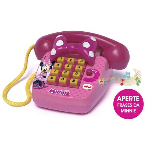 Telefone sonoro com frases da Minnie! Brinque como fone, aperte as teclas e botão com frases da sua personagem predileta da Disney.